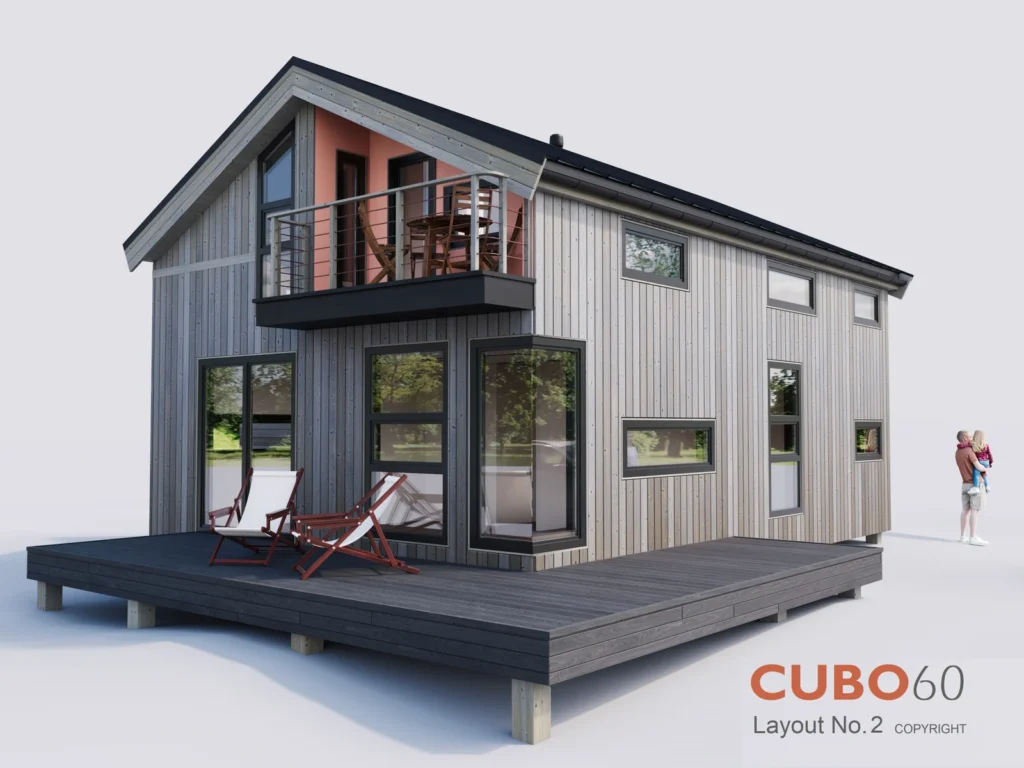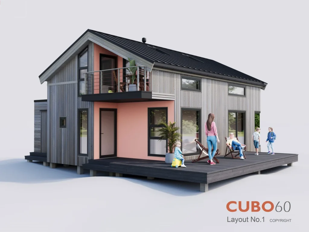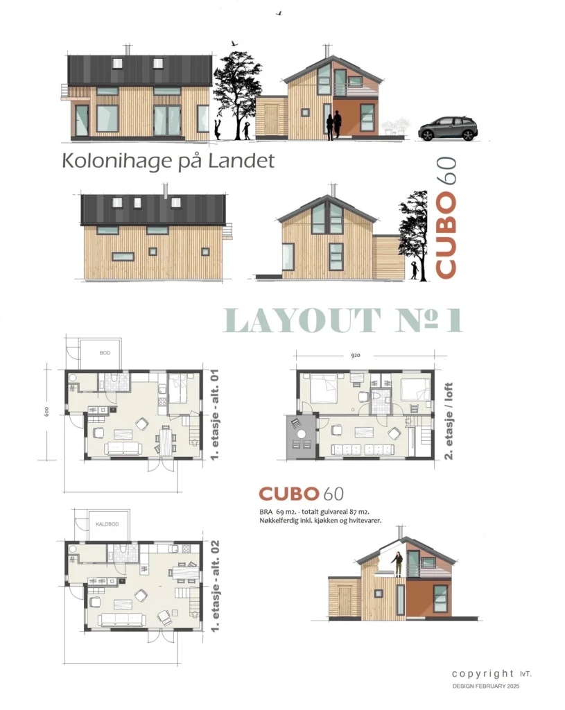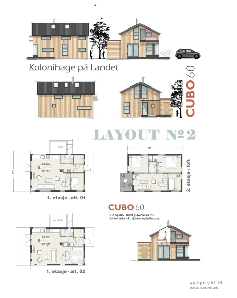 Skisse viser kolonihytten Cubo 60 som planlegges på 19 tomter. Denne kan ha variasjoner i innredning som for eks. 2 til 4 soverom, ekstra baderom på loftet, velge bort terrasse på loftet til fordel for kvadratmeter inne, med eller uten kaldbod, etc.